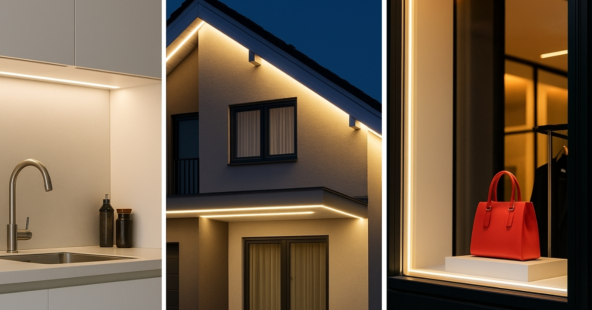LED pásky najdou uplatnění prakticky kdekoli, kde potřebujete světlo, ať už pro funkční nasvícení nebo pro dekorativní efekty. V interiéru se používají k podsvícení kuchyňských linek, polic, stropních podhledů nebo schodišť, kde zajišťují jak estetiku, tak i bezpečnost. V exteriérech slouží k osvětlení fasád, pergol, zahradních cest nebo bazénů, přičemž díky vhodnému krytí odolají dešti i prachu. Velmi oblíbené jsou také v komerčních prostorech například ve výlohách, světelných reklamách nebo k nasvícení produktů, kde dokáží přitáhnout pozornost zákazníků. Díky širokému výběru barevných teplot a možnostem RGB efektů se LED pásky hodí i pro vytvoření příjemné atmosféry v obývacích pokojích, ložnicích či barech.