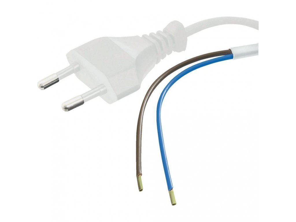 Flexo napájecí kabel v bílém provedení pro montáž do zařízení. Dvoužilový kabel je zakončený standardní přístrojovou dvoukolíkovou zástrčkou a na druhém konci volné dva vodiče.