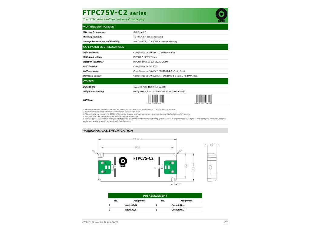 FTPC75V12-C2 | napájecí zdroj pro LED | 12V | 75W | 6,25A | IP20