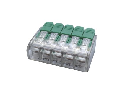Kompaktní svorka pro rychlé a bezpečné spojování pěti vodičů bez nářadí. Vhodná pro pevné i lankové vodiče v rozsahu 0,5–6 mm², ideální do instalačních krabic.