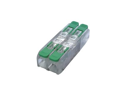 Inline kompaktní svorka pro rychlé a bezpečné spojování čtyř vodičů bez nářadí. Vhodná pro pevné i lankové vodiče v rozsahu 0,5–2,5 mm², ideální do instalačních krabic.