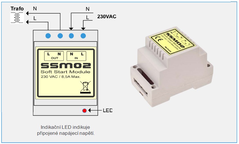 Modul SSM02 má robustní konstrukci bez polovodičových spínacích prvků, a je proto velmi odolný proti přepětí a vysokým proudovým rázům. Modul nemá žádné nastavovací prvky a čas 1 sekundy je vhodný pro mnoho aplikací.