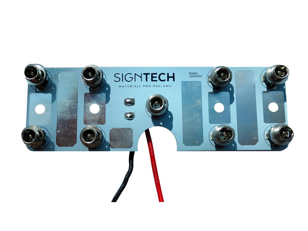 Rozbočovací plošný spoj určený pro rozvedení napájení z jednoho napájecího zdroje na více výstupů. Všechny výstupy jsou zapojeny paralelně, tj. se stejnou polaritou jako vstup. Konstrukce je provedena na desce plošných spojů z materiálu FR4 s pocínovanými cestami pro zajištění spolehlivého vedení proudu.