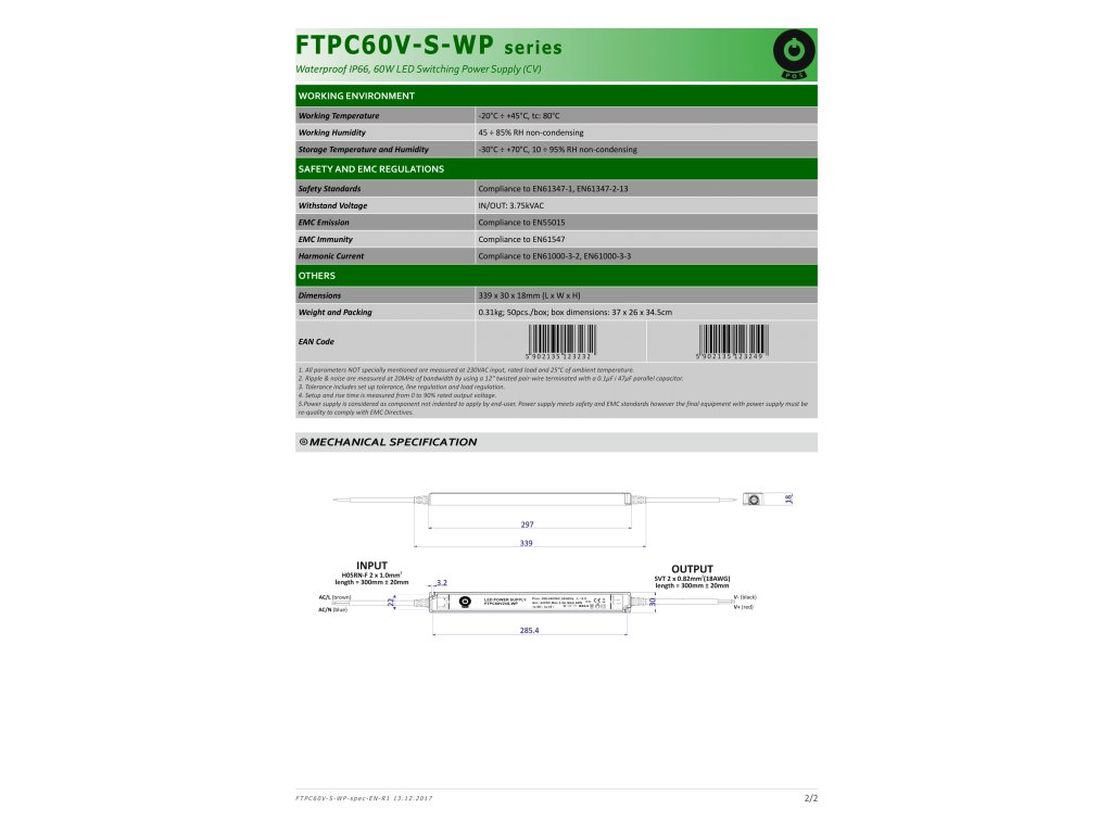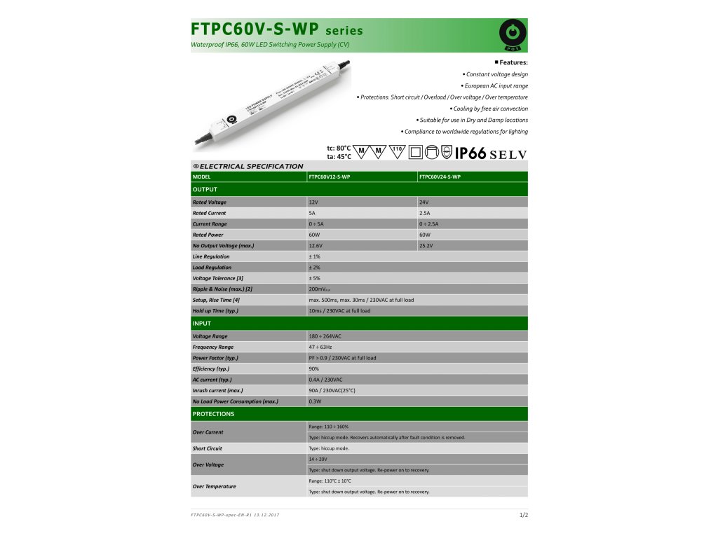 Napájecí zdroj FTPC60V12-S-WP je malý, kompaktní napájecí zdroj, výstupní napětí 12V, výkon 60W.