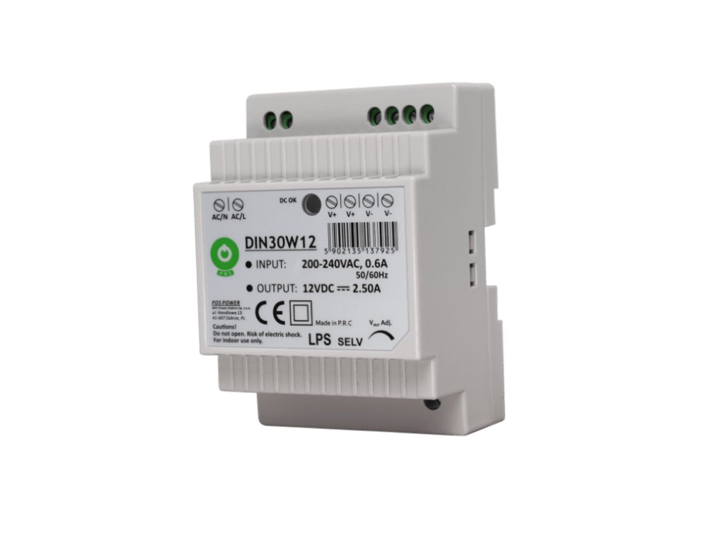 Kompaktní napájecí zdroj s výstupem 12 V DC a výkonem 30 W, určený pro montáž na DIN lištu TS-35.