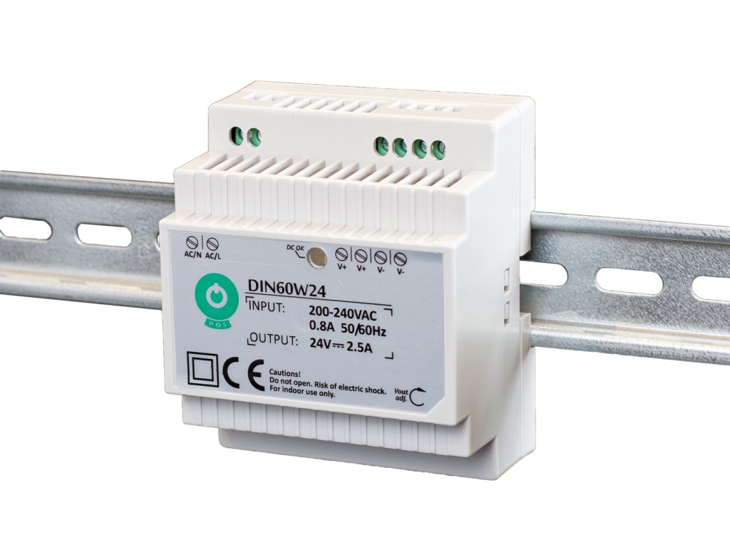 Kompaktní napájecí zdroj s výstupem 24 V DC a výkonem 60 W, určený pro montáž na DIN lištu TS-35.Vhodný pro průmyslové i domácí aplikace.